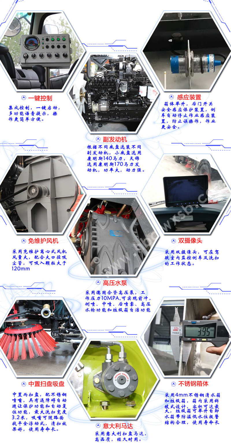 清洗寬度:3.5m,低壓沖洗寬度:≧21m, 水炮射程≧35m,水箱容積:8m3 1、具有灑水車的前沖、后灑、高噴、側噴功能。 2、后部2套噴霧降塵系統,噴霧頭分別是21個和16個,能有效降塵降溫;側面卷盤,可清洗路緣、人行道、護欄隔離區、路標、廣告牌、高架路等。 3、前部高壓清洗裝置,能夠伸縮、轉向,最大限度的有效清洗路面的污漬、油漬。 4、高壓水泵采用德國進口泵,當高壓水泵起動及工作水閥切換時,水泵能自動卸荷。通過空循環、安全閥和溢流閥三重保護,有效防止高壓水泵損壞。 5、副發動機帶車用離合器,起動和停機時,氣缸驅動離合器分離,延時后接合。離合器的分離與接合,由電控系統自動控制,無需人工操作,有效避免高壓水泵、發動機的損壞。 |